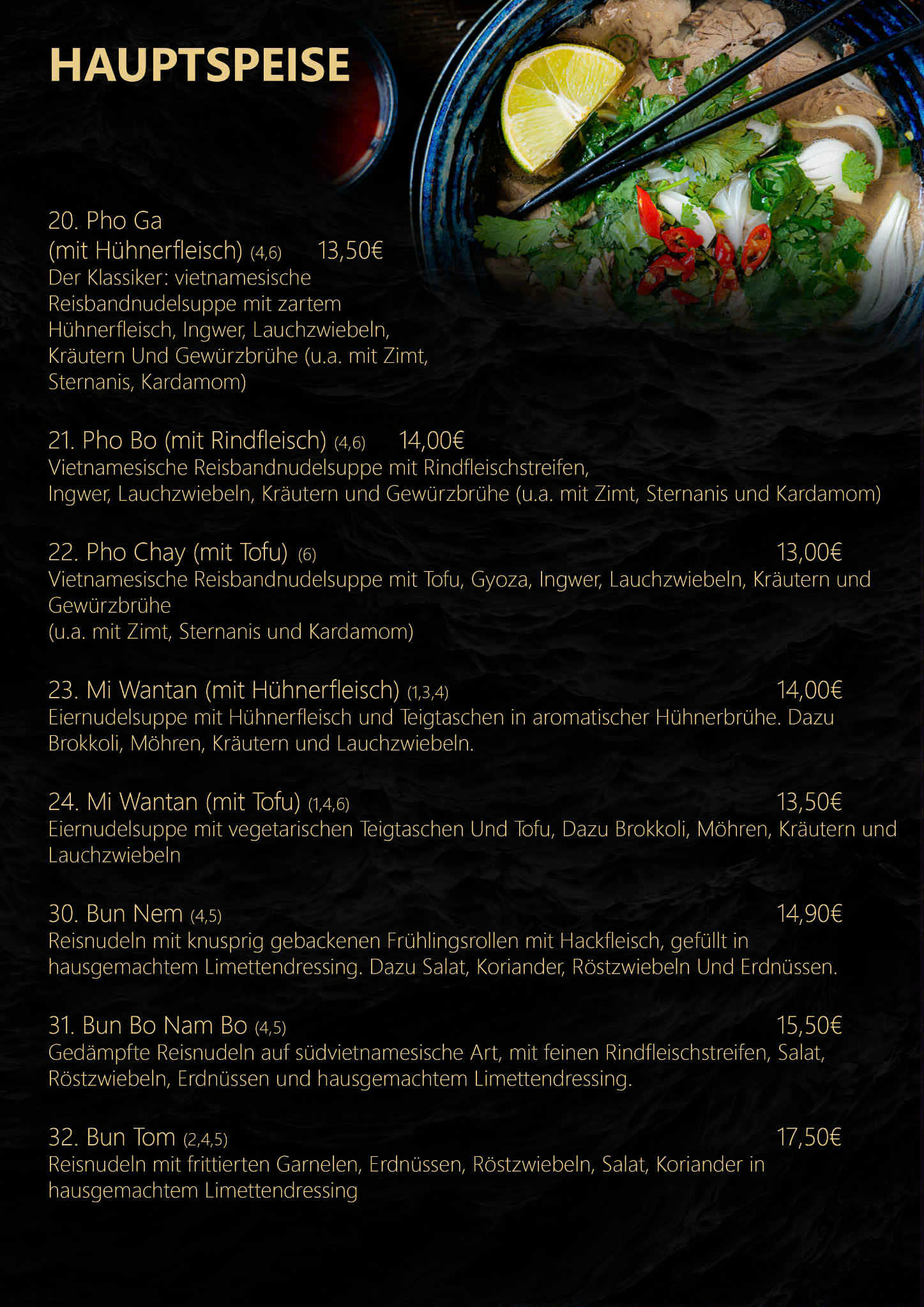 Unsere Speisekarte bei HanoiPho ist eine Reise durch die faszinierende Welt der asiatischen Küche. Ob feines Sushi, aromatische vietnamesische Pho-Suppen oder kreative japanische Spezialitäten – jedes Gericht wird frisch, sorgfältig und mit Liebe zum Detail zubereitet.